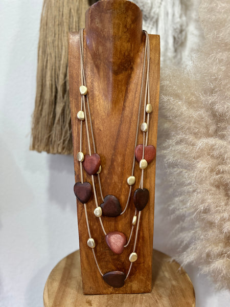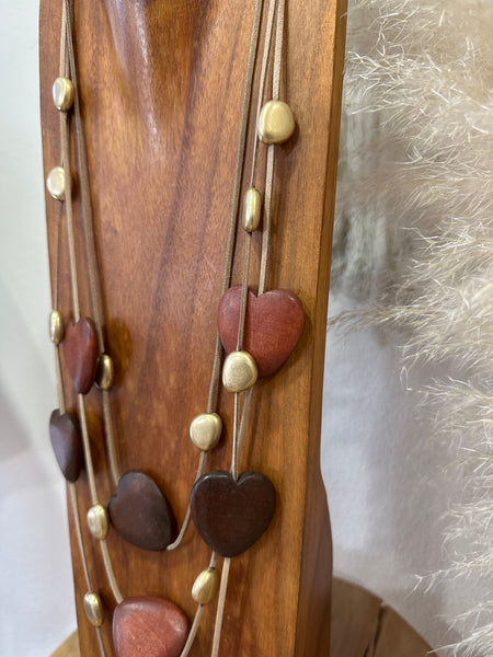 Colar comprido com tres voltas em camurça, com detalhes em madeira pintada e detalhes em dourado,  corrente de ajuste e fecho lagosta.