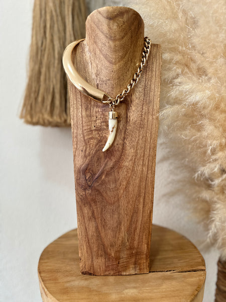 Gargantilha em aço dourado, metade em corrente metade em aro rígido, detalhe em acrílico, corrente de ajuste e fecho lagosta