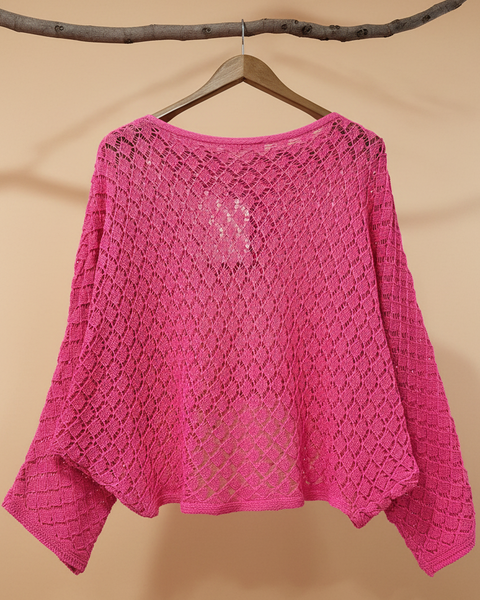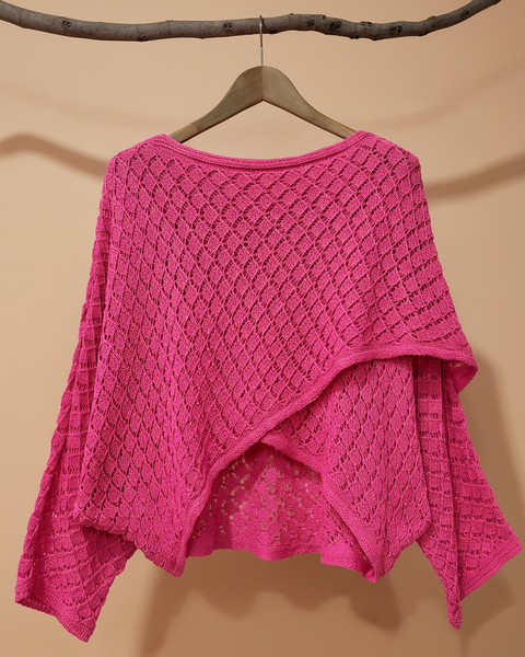 Poncho rosa pink de malha vazada - vista traseira com mangas largas