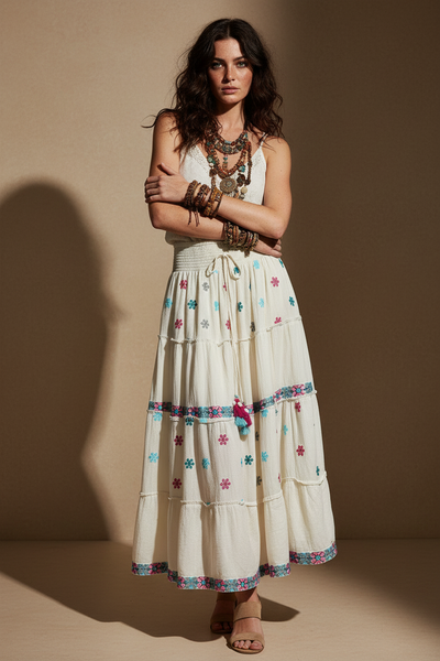 Saia maxi em algodão cru com corte evasé em camadas, decorada com delicados bordados florais coloridos em tons de turquesa, rosa, verde e cinza. Cintura elástica franzida com cordão, fitas bordadas geométricas e bolsos laterais com pompons coloridos. Peça fluida e romântica de inspiração boho-chic.