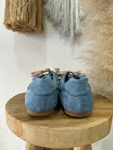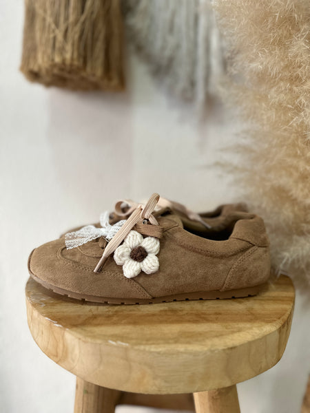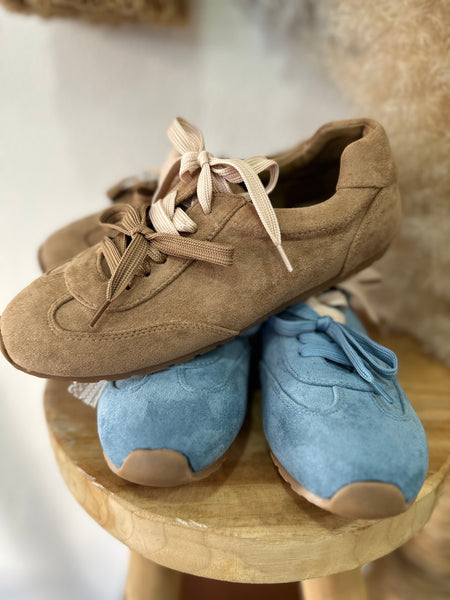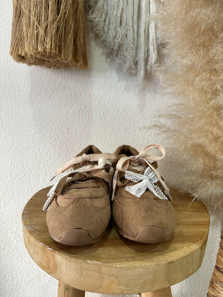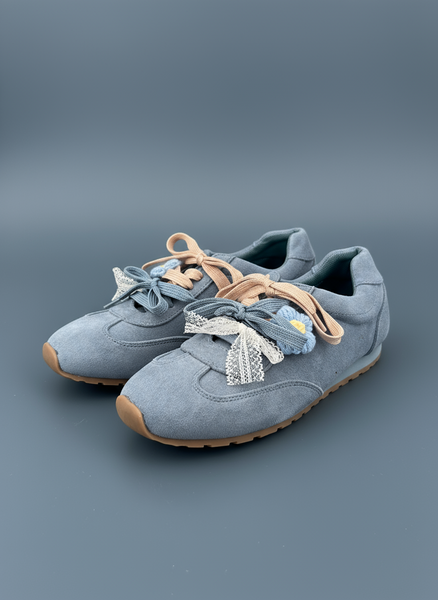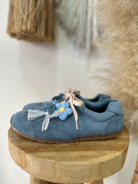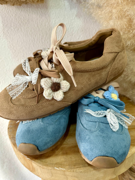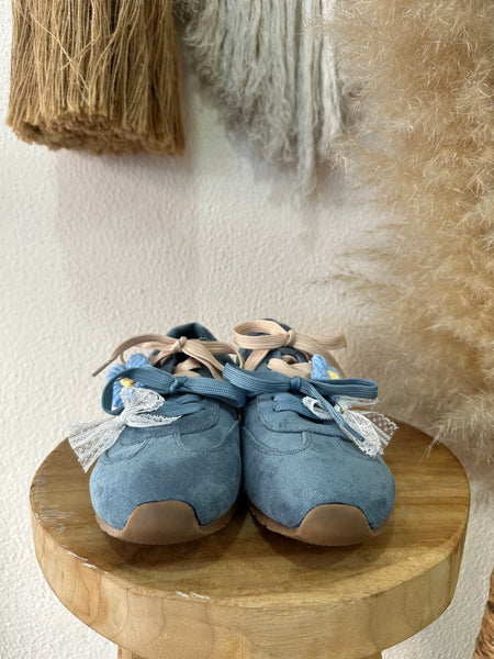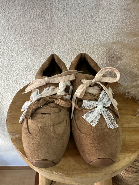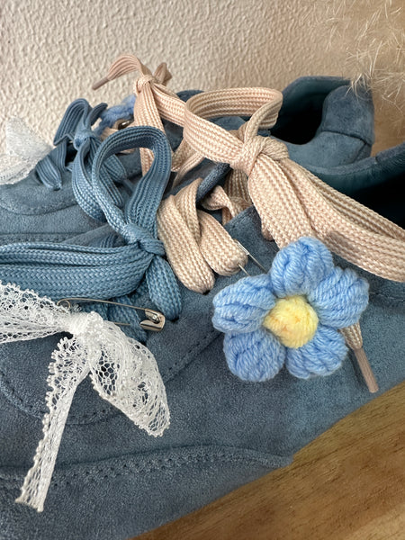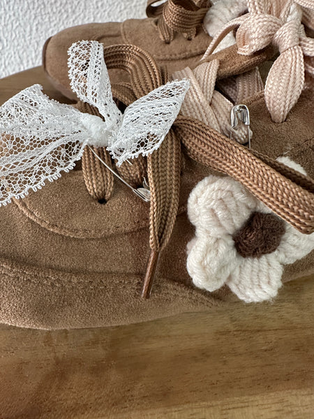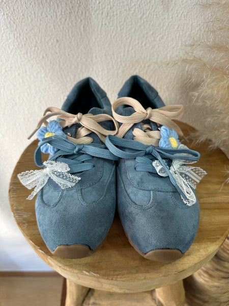 Ténis em ecopele tipo camurça, com dois pares de atacadores e aplicações amovíveis