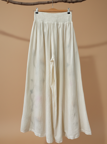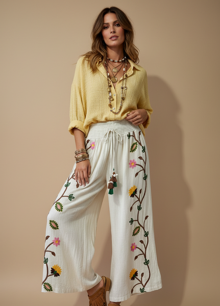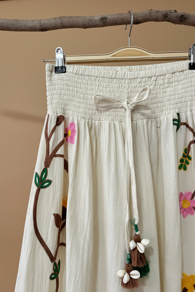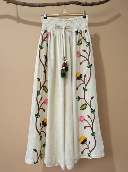 Calças largas em algodão cru com bordados florais artesanais. Cintura elástica franzida com cordão, corte amplo e fluido. Peça única de inspiração boho-chic, fabricada na Índia com motivos de ramos e flores bordados em tons de amarelo, rosa, verde e castanho, com detalhes de borlas decorativas.