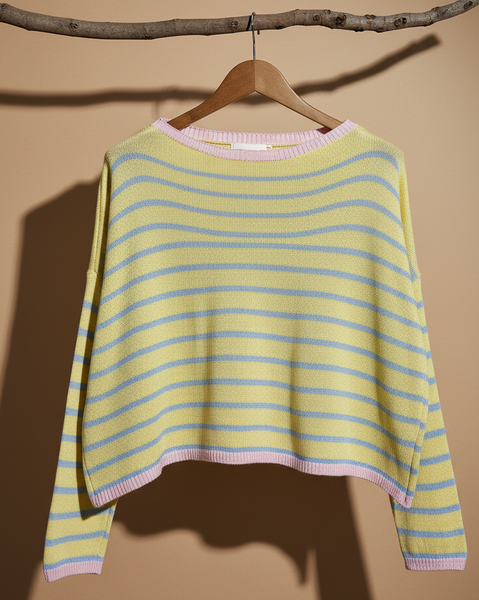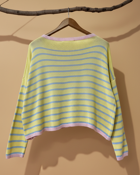 Camisola em malha fina com riscas horizontais. Decote redondo com acabamento canelado rosa, mangas compridas e corte oversized. Peça leve e colorida em tons de amarelo e azul com detalhes em rosa, ideal para um look casual e vibrante.