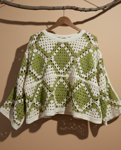 Camisola em crochet granny square com padrão geométrico floral. Decote redondo, mangas sino amplas e corte oversized. Peça em tons de cru e verde oliva com motivos em losango, perfeita para um look boho-chic romântico e descontraído.