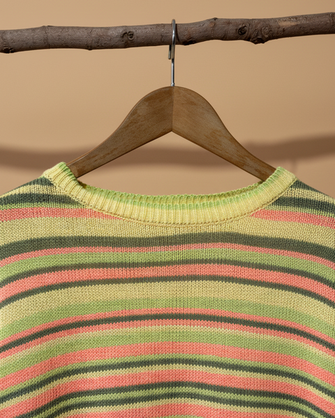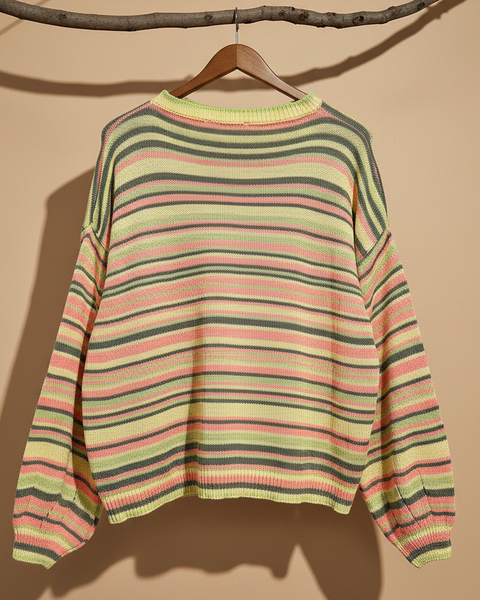 Camisola oversized em malha fina com riscas horizontais multicolor. Decote redondo canelado, mangas balão e corte amplo. Peça leve e vibrante em tons de amarelo, verde, coral e rosa, perfeita para um look colorido e descontraído.