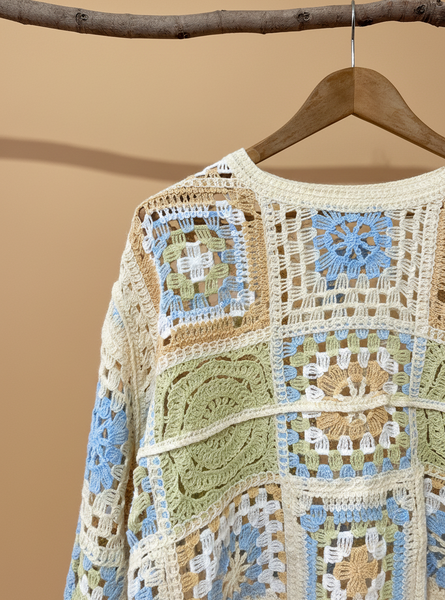 Camisola curta em crochet granny square com quadrados em tons de azul, verde, bege e branco. Corte cropped, mangas compridas e acabamento tipo artesanal. Peça única perfeita para um look boho-chic vintage.