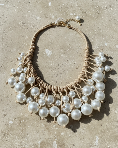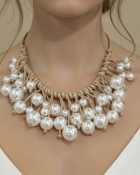 Colar statement em corda bege artesanal com cascata de pérolas brancas de diferentes tamanhos. Design boho-chic sofisticado que combina a elegância intemporal das pérolas com a textura natural da corda entrelaçada. Fecho ajustável em dourado com detalhe decorativo. Peça única que eleva qualquer look, perfeita para ocasiões especiais ou para dar um toque luxuoso ao dia a dia.