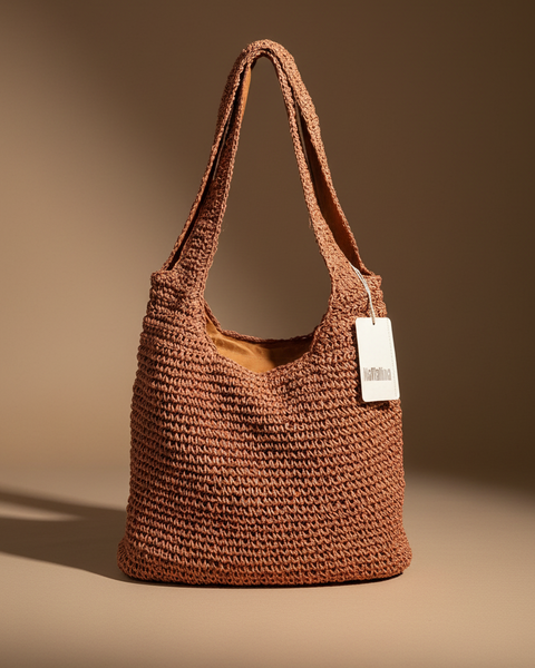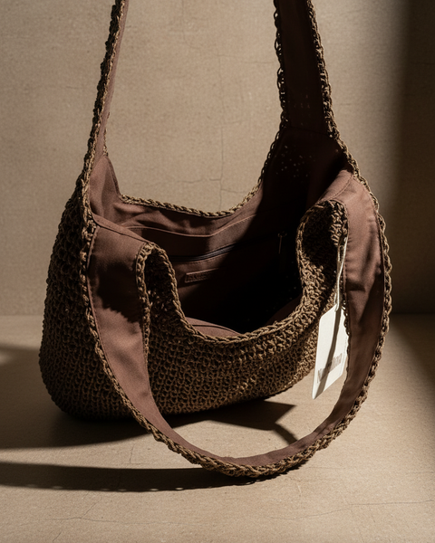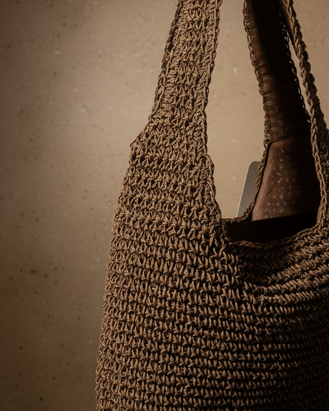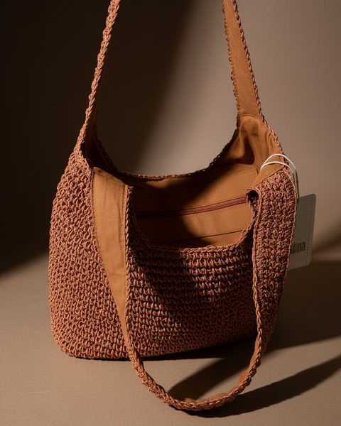 Mala hobo em crochet de ráfia com alças de ombro. Design slouchy e textura artesanal que combina estilo boho-chic com funcionalidade. Interior forrado com bolso e com fecho. Disponível em terracota e castanho chocolate. Medidas: 42x34cm.