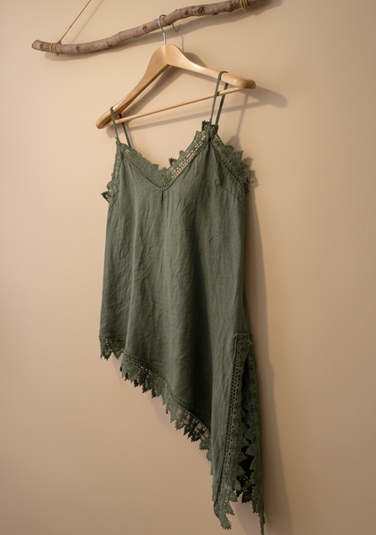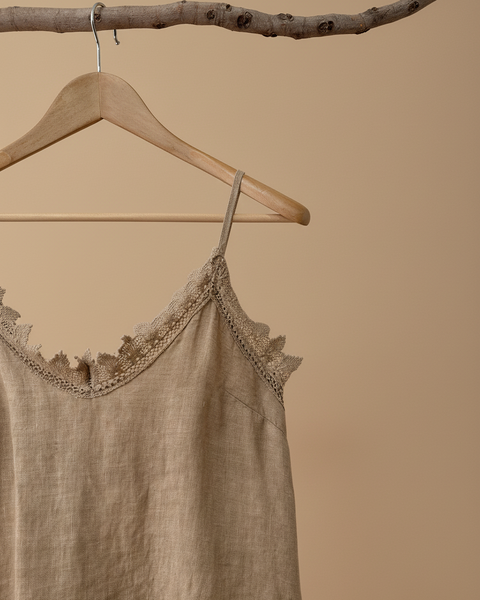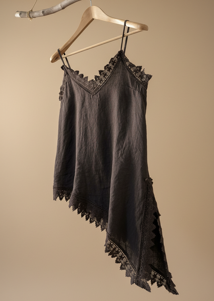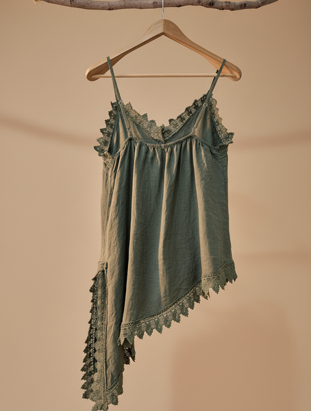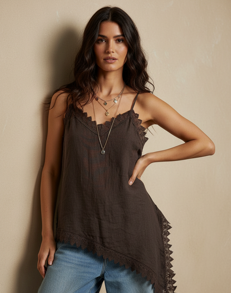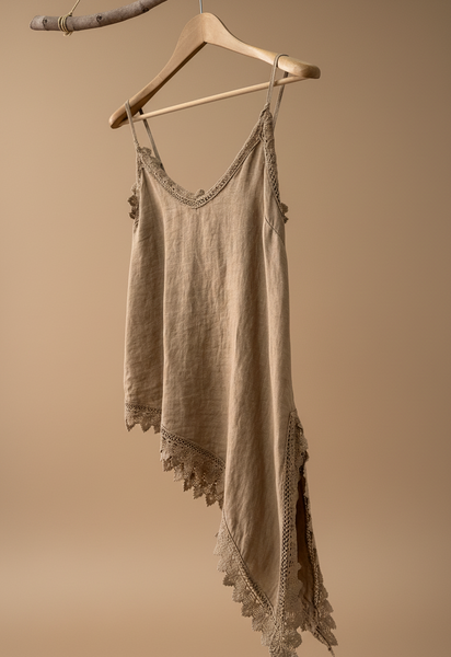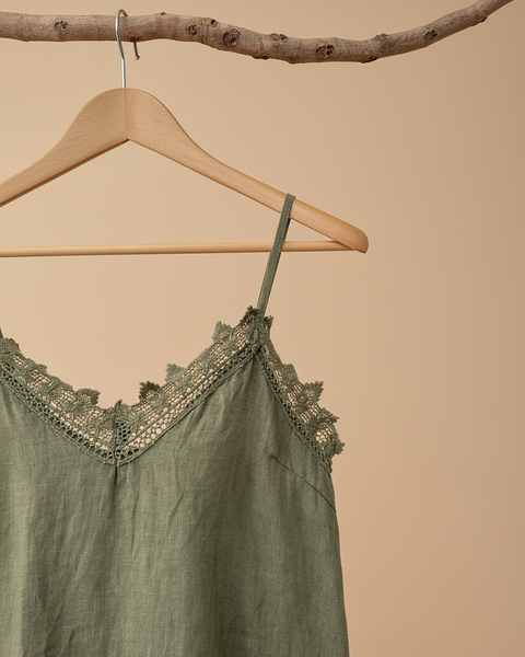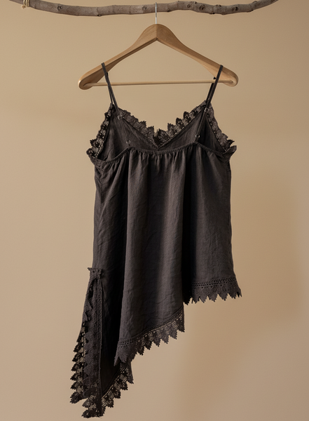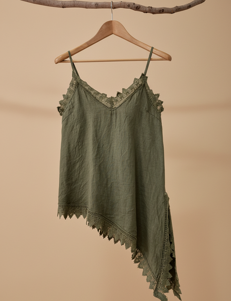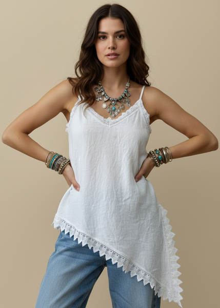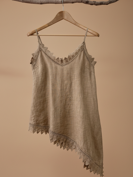 top de alças finas em linho com decote em V e renda a condizer ao longo do decote, racha lateral e bainha assimétrica. Leve, fluido e com aquele toque boho sensual que é a essência da Naftalina. Perfeito para os dias quentes, sozinho ou por baixo de um casaco