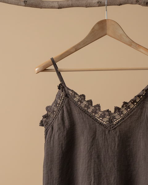 Top linho castanho — lateral